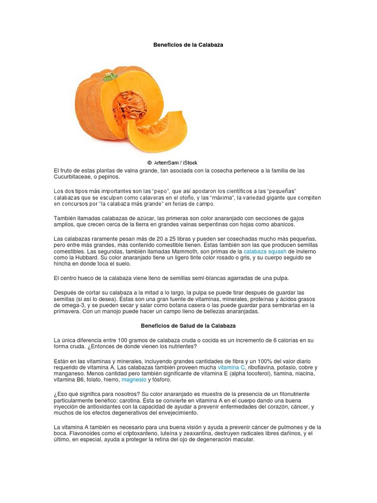 Para que sirve la calabaza cruda. Una sola taza de calabaza contiene más del 200 por ciento de la ingesta diaria de vitamina A recomendada para la mayoría de personas lo que la convierte en una opción extraordinaria para la. - estimular la función del páncreas ya que ayuda a regular los niveles de azúcar en sangre. Al parecer la planta calabacera pariente botánica del melón el calabacín la sandía y el pepino tuvo su origen en la zona entre Guatemala y México donde hace unos diez mil años se consumían variedades silvestres que tenían poca pulpa y sabor amargo.